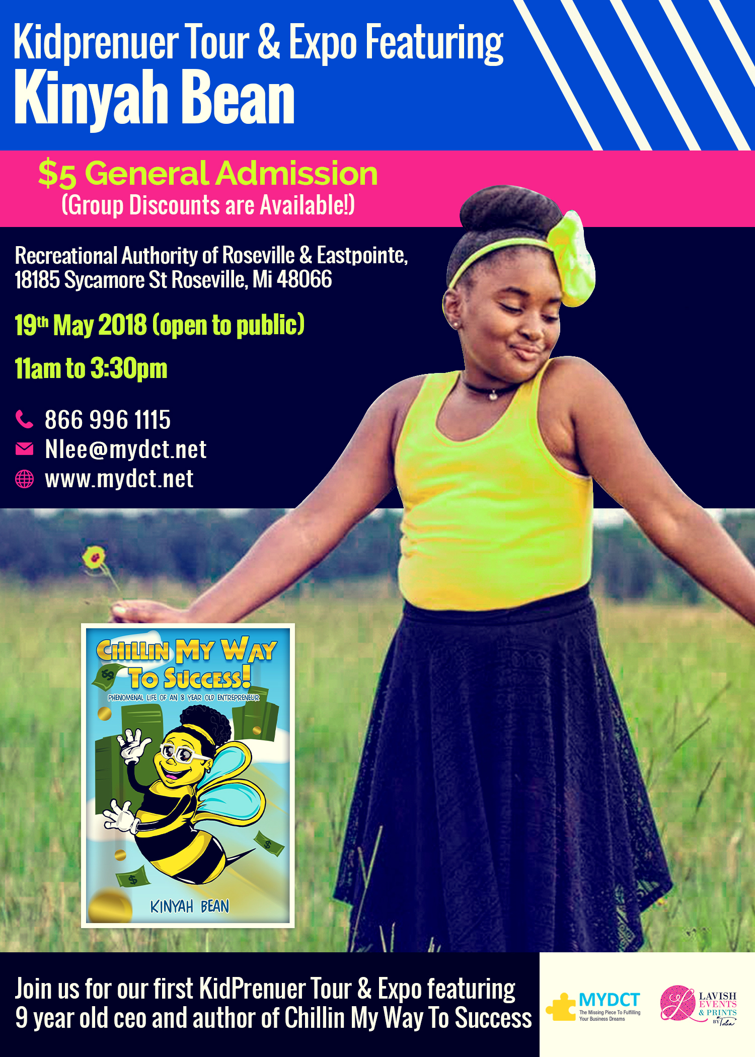 Who is Kinyah Bean? Kinyah Bean is a 9 year old extraordinaire who is both an entrepreneur and author. She’s been on tour from Mississippi, Los Angeles, St. Louis and is now heading to Detroit to inspire students 7 to 19 to start their path in entrepreneurship.