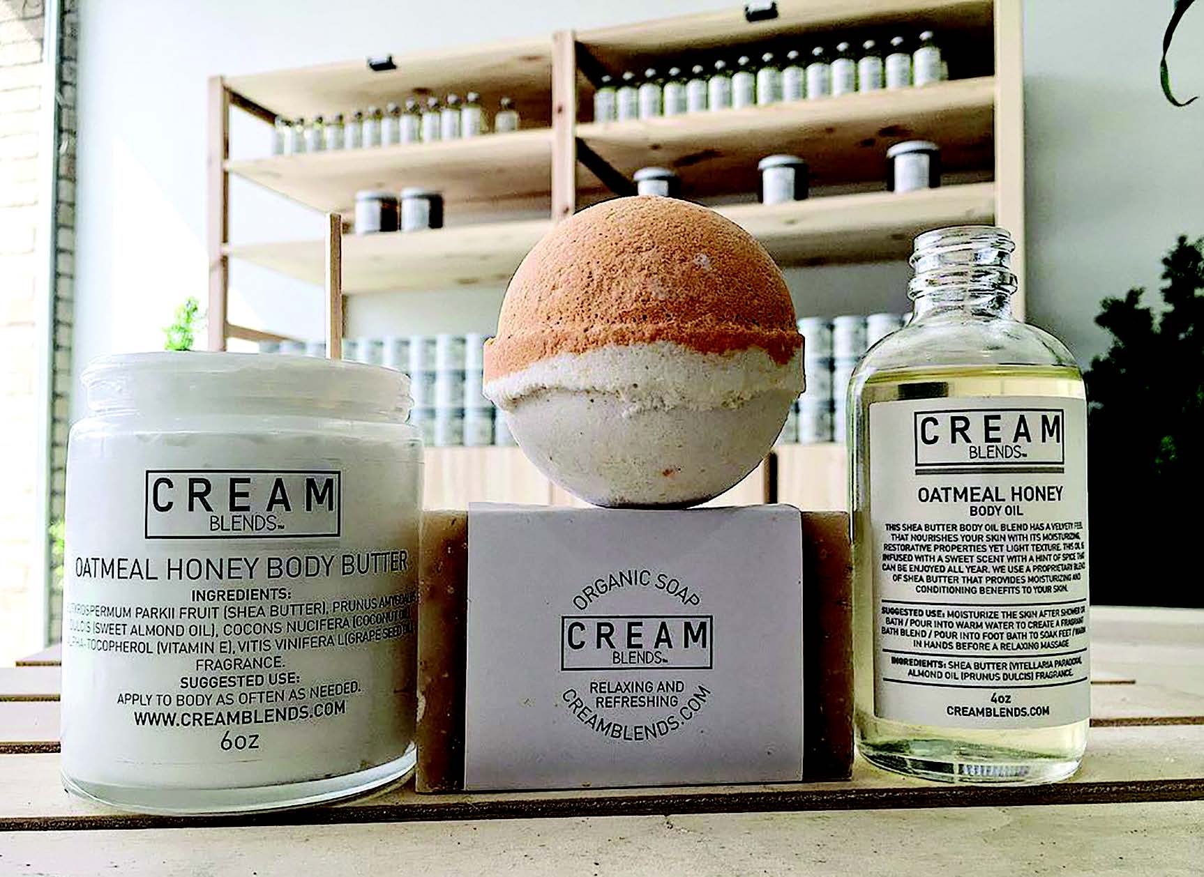 Oatmeal Body Butter, Oatmeal Soap, Oatmeal Body Oil and Bath bomb…going to be a relaxing night after using this set! $46 Visit. www.CremeBlends.com (Note: Oatmeal Honey set available in store!)