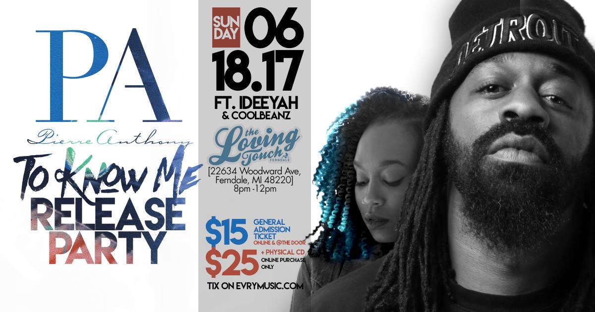 Sunday, June 18th | 8 pm | The Loving Touch TO KNOW ME RELEASE PARTY: Pierre Anthony’s offical album release party for “To Know Me” is Sunday, June 18 at The Loving Touch from 8pm-midnight. INFO: evrymusic.com