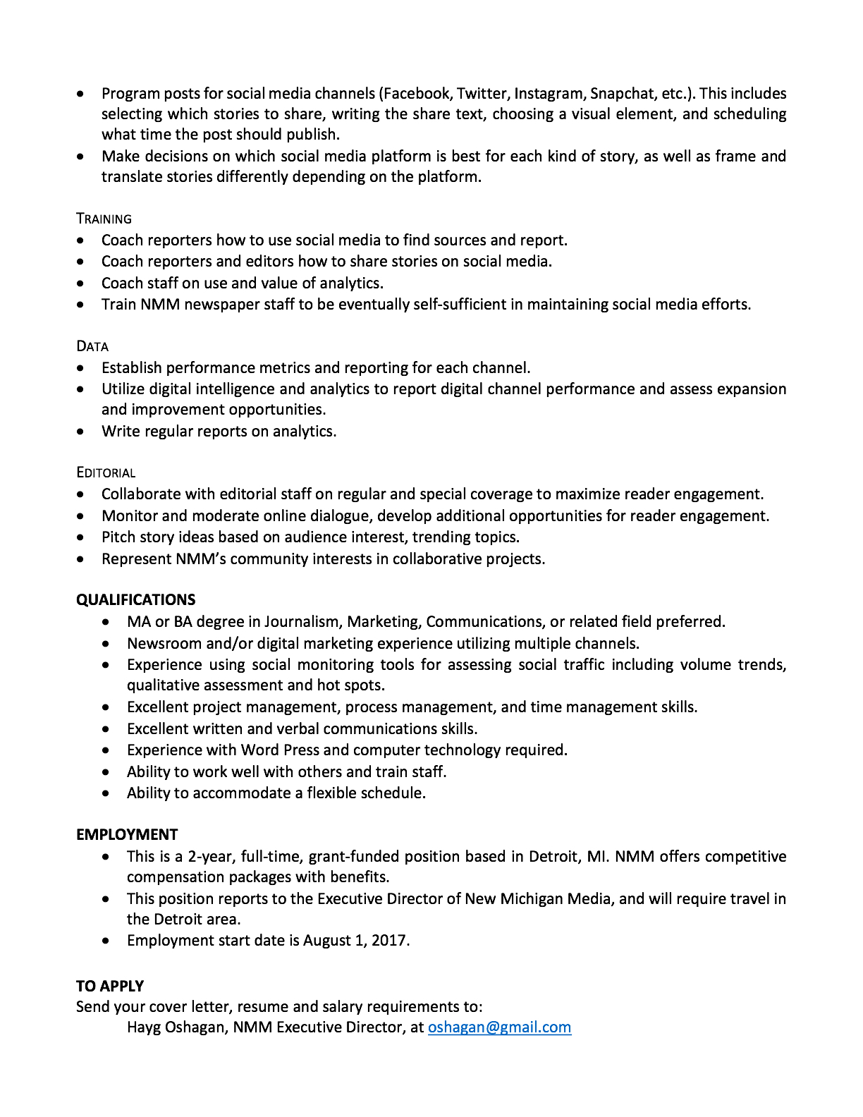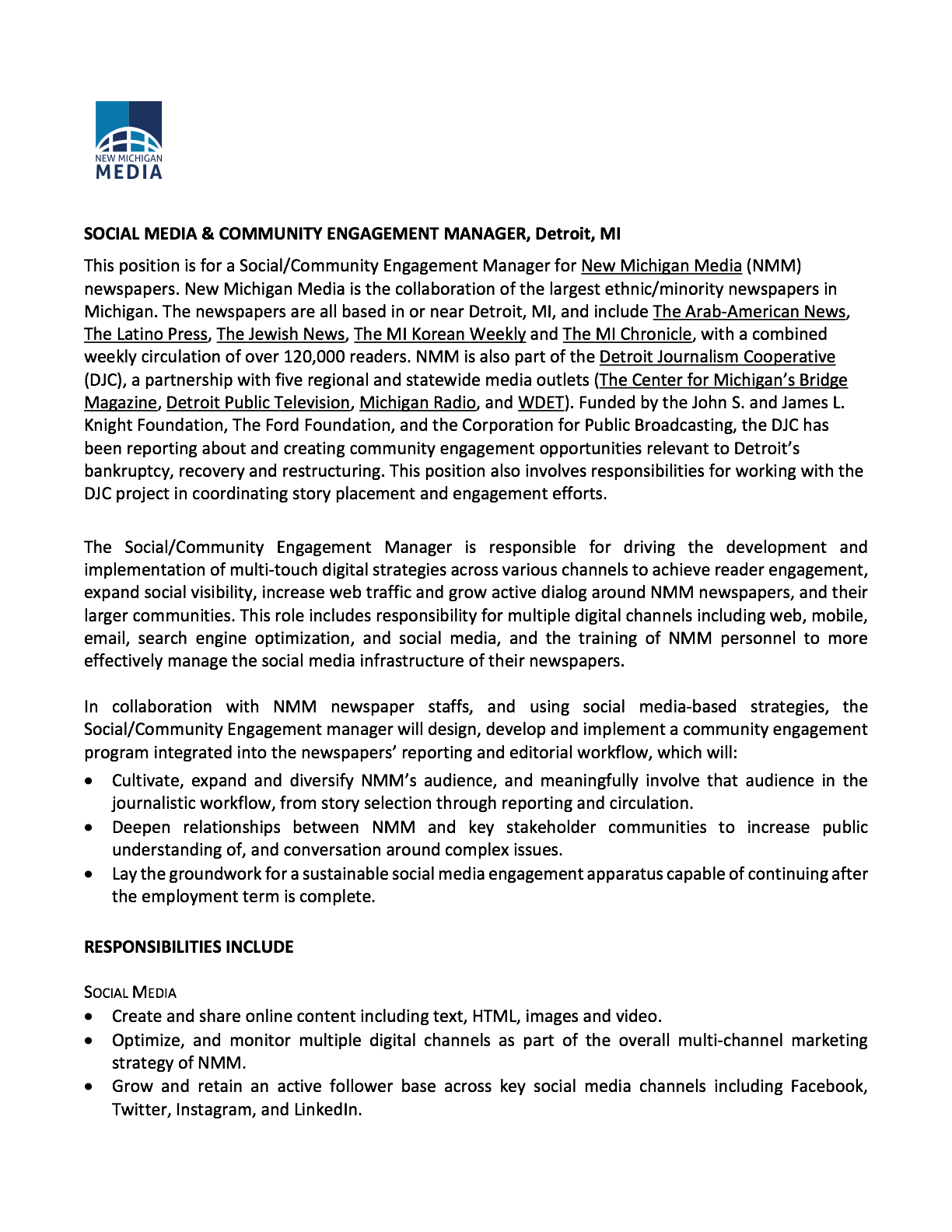 If you or anyone you know has great social media skills and is also good at instructing others in those skills, please review and share the attached job information. The Detroit Journalism Cooperative, of which I am a member, is looking to hire someone for what promises to be a very challenging and interesting job that would also help us out quite a bit as all our local community newspapers work together toward taking it to the next level in terms of social media engagement. Thanks.