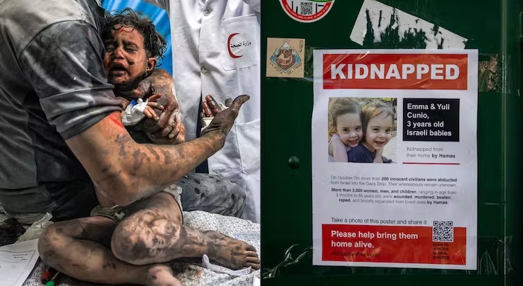 Both Palestinian children in Gaza, as shown on left, and Israeli children, as seen on the right, have been hurt, killed and kidnapped in the Israel-Hamas war. Mahmud Hams/AFP via Getty Images/Roy Rochlin/Getty Images