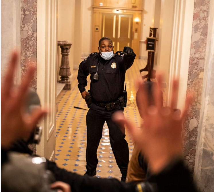 U.S. Capitol Police Officer Eugene Goodman saw what was happening before the people with titles did. The video shows him on that stairwell with a mob in front of him, then behind him, then gaining. He gets to a landing and spots an unguarded access point near the Senate side. That is the part people skip past when they want to keep the story soft. He notices the vulnerability and he moves the threat away from it. He turns his body and turns them with him.