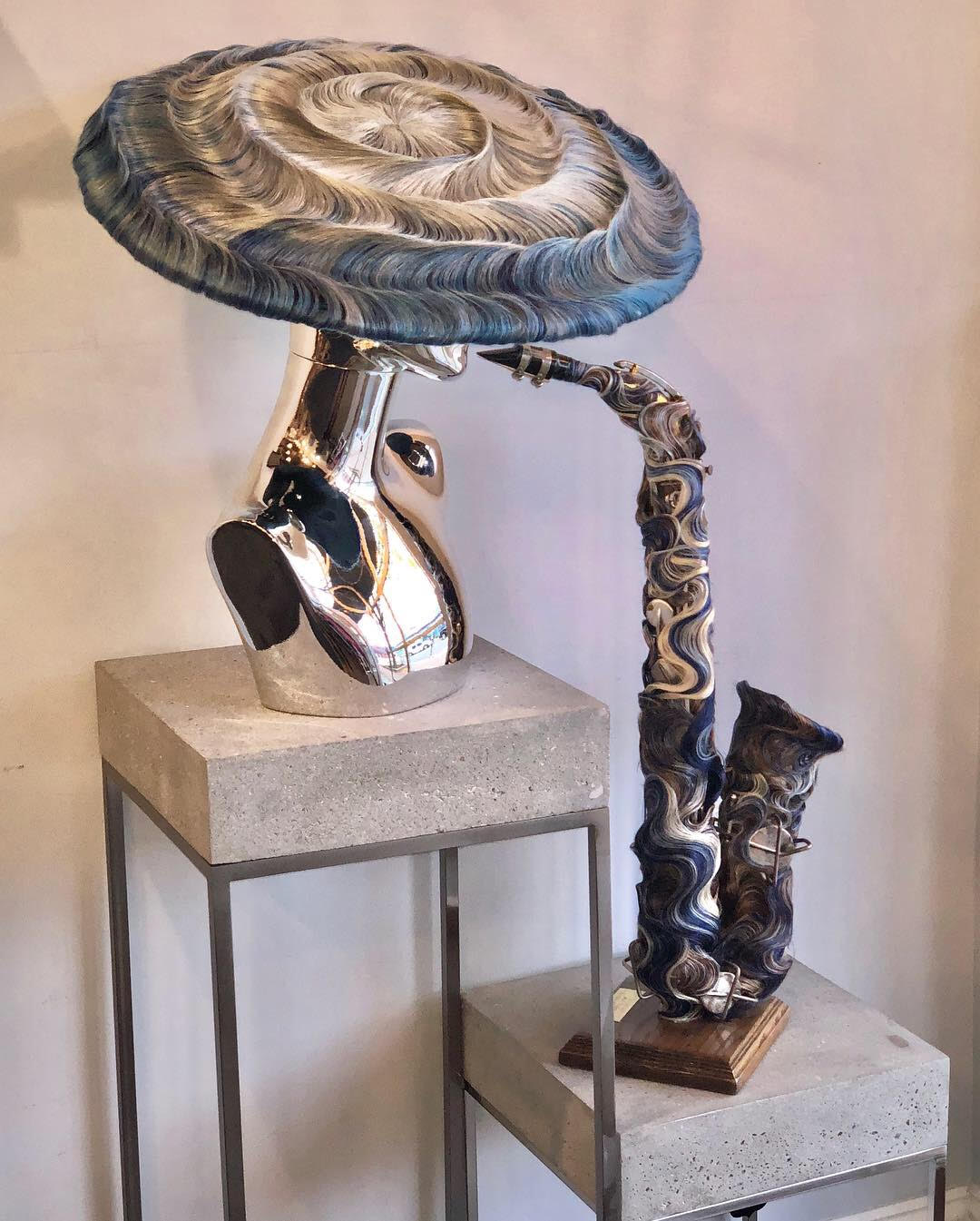 Beaty: It started with me displaying my hairpieces from shows/shoots in the salon. The response was so great from everyone that came in or walked by, that I decided to collaborate with Sam at Design Dujour interior design. He allowed me to incorporate one of my hair sculptures into his design at the Junior League of Detroit Showhouse last year. Which was a challenge, because the room was designed to be a man cave of sorts. I decided to create a saxophone hair sculpture, (it was the first time I sculpted off ahead form). My “hairy sax” became the talk of the house. Earlier this year, it was accepted into the Gilda Snowden Memorial Exhibition at The Scarab Club. My idea that hair art can exist on interior design and fine art platforms was manifested.