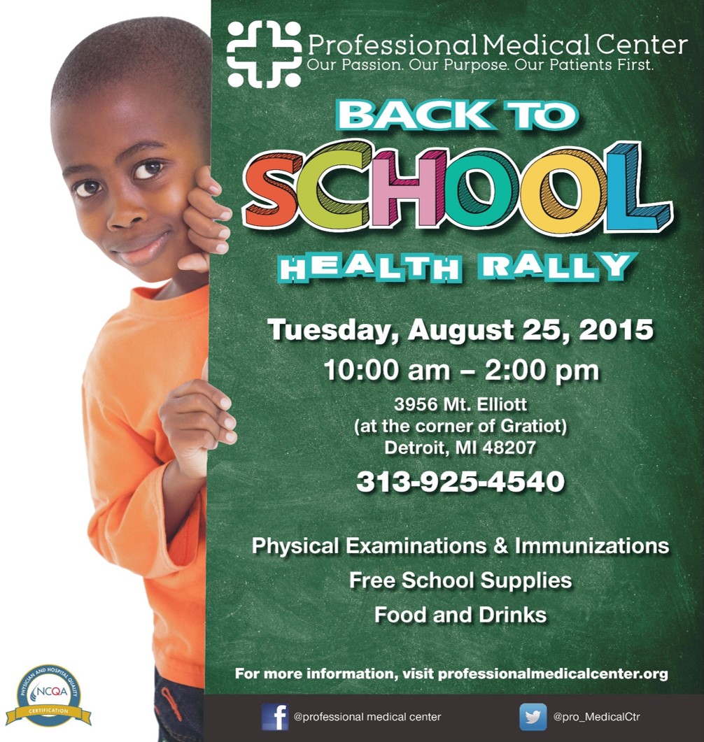 Professional Medical Center will host their first annual Back to School Community Health Rally, Tuesday, August 25, 2015, from 10am-2pm at 3956 Mt. Elliott (PMC eastside location). In efforts to promote the importance of protecting infants and children against potentially life-threatening diseases Professional Medical Center will offer physical examinations as well as immunizations to children 3-18 years of age. In keeping with Professional Medical Center’s commitment to better serve the community individuals without medical coverage, the underinsured and individuals with low income health insurance are encouraged to participate. Professional Medical Center’s team of board certified physicians/ medical professionals will be onsite to administer the immunizations. In addition, there will be food, music and activities for the entire family.
