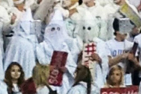 The three students, who attend Red River High School in Grand Forks, North Dakota were photographed sitting in the stands during a Friday night hockey game, wearing traditional KKK garb. According to ABC News, the students put on the gear after the first goal and were caught wearing it for about 30 seconds to a full minute. The students may not have been noticed upon first glance because they were sitting in a section for fans called Red River Roughriders and in that section, everyone dresses in white as a part of the “whiteout” that many hockey fans have been doing at games for the last 25 years.
