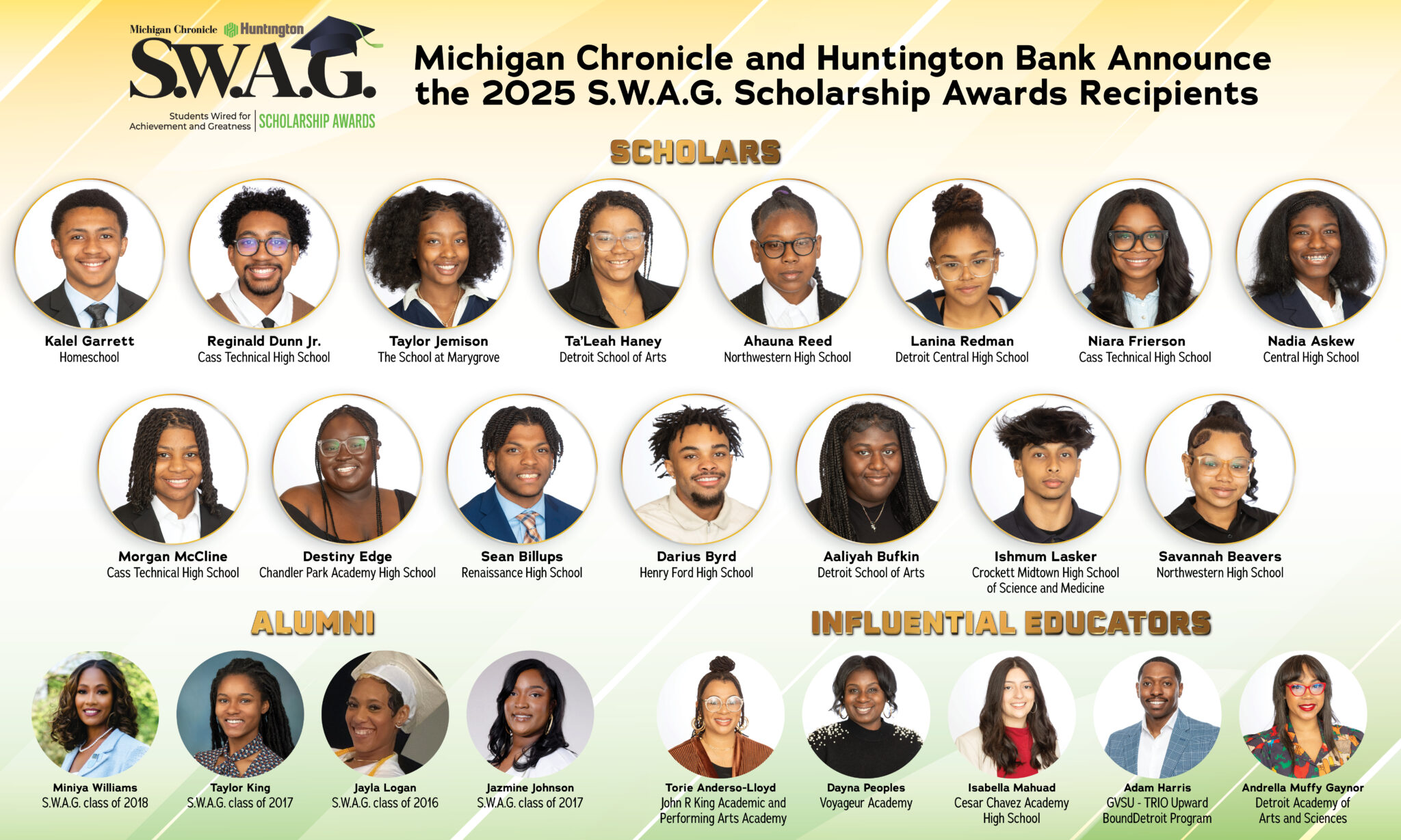 The Michigan Chronicle and Huntington Bank proudly recognize the remarkable achievements of the 2025 S.W.A.G. (Students Wired for Achievement and Greatness) Scholarship Award recipients. Your dedication and perseverance exemplify the spirit of excellence in our community. We also honor the alumni who continue to inspire, and the influential educators whose guidance shapes future leaders.