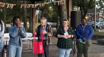 Nneka Ezeanya offers a goodie bag from Book Suey in Hamtramck to winner Bill “Dollar Dollar.” Runner-ups Martin and Quincy stand beside him. The store supplied a t-shirt, $25 gift card, a word search and bookmarks.
