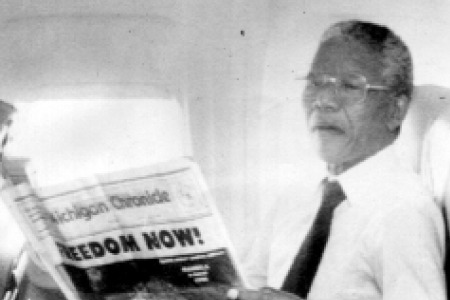 Nelson Mandela reads Michigan Chronicle as he departs from Detroit’s Metro Airport